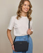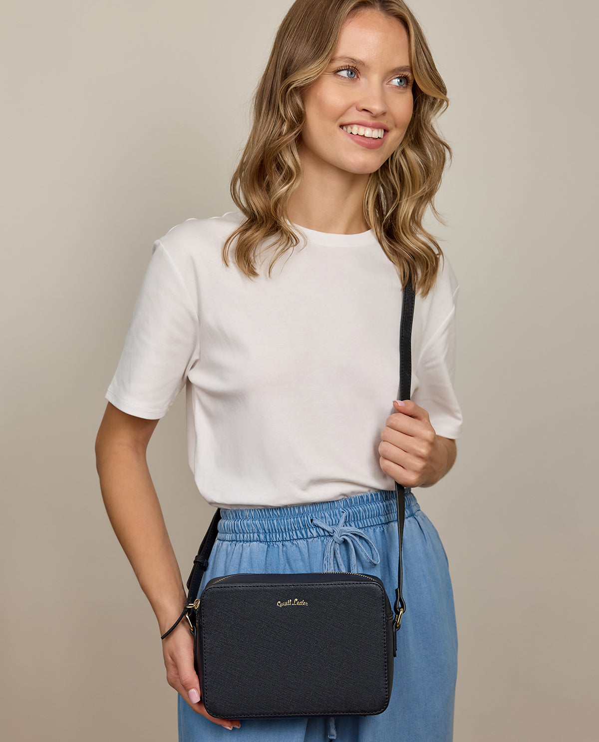 Während der goldene Reißverschluss dafür sorgt, dass all Deine Habseligkeiten schön sicher verstaut sind, verleiht das strukturgeprägte schwarze Saffiano-Leder „Almina“ derweil einen Hauch von Chic und vornehm-zurückhaltender Klasse.