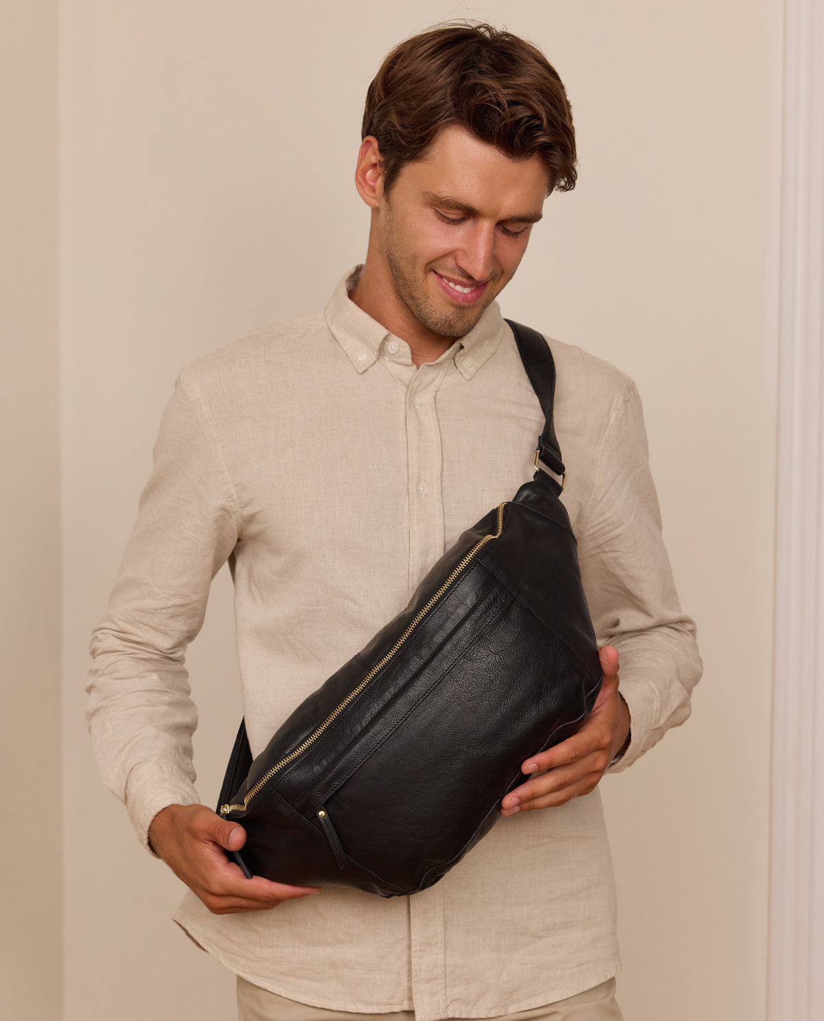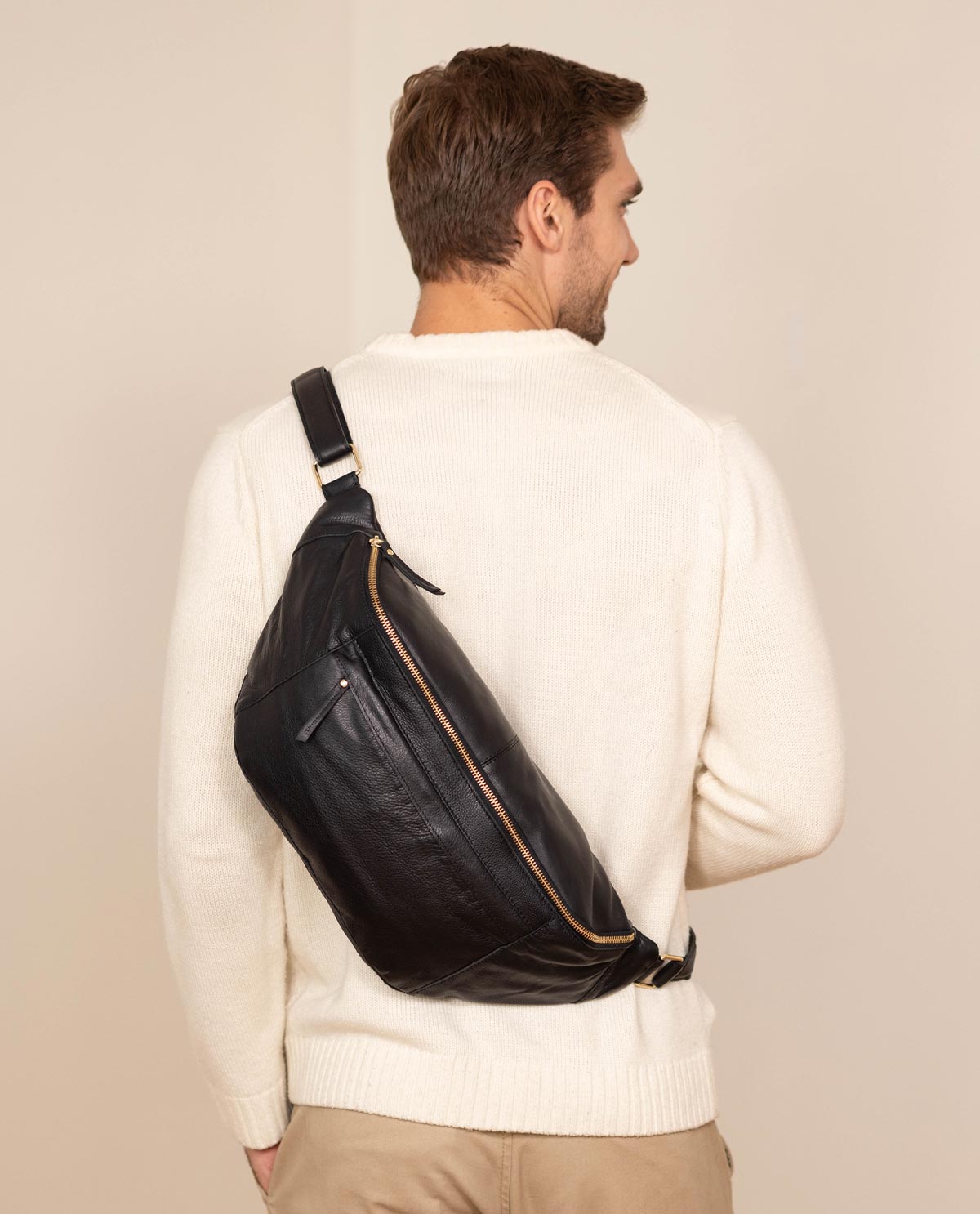 This robust and spacious cowhide leather bum bag-style bag combines the advantages of a compact backpack with a trendy, casual-cool bum bag, so you’ll always look good with this soft leather bag with gold zips. “Esben” can accompany you anywhere, so you can take everything you need with you while still looking cool. “Esben” has more than enough space for your phone, keys, purse, pocket organiser, pencil case, and more!