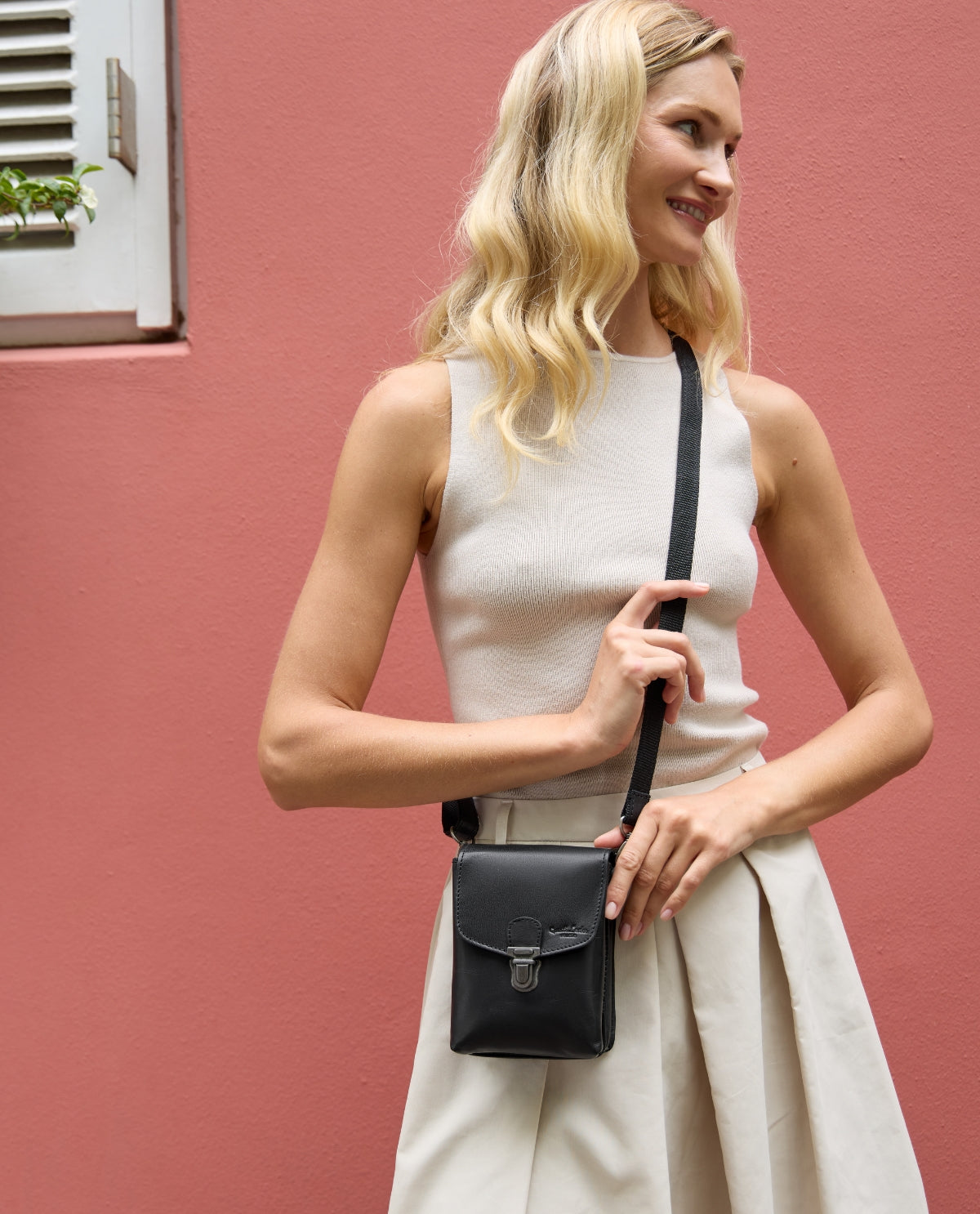 Want to carry “Nelly” on your shoulder? No problem, thanks to her adjustable strap that attaches easily to the side of this belt bag. There's more than enough space in the main compartment for all of your essentials, like your phone, a small torch, tissues, purse, gum, and more. The practical discreet snap lock completes “Nelly's” design.