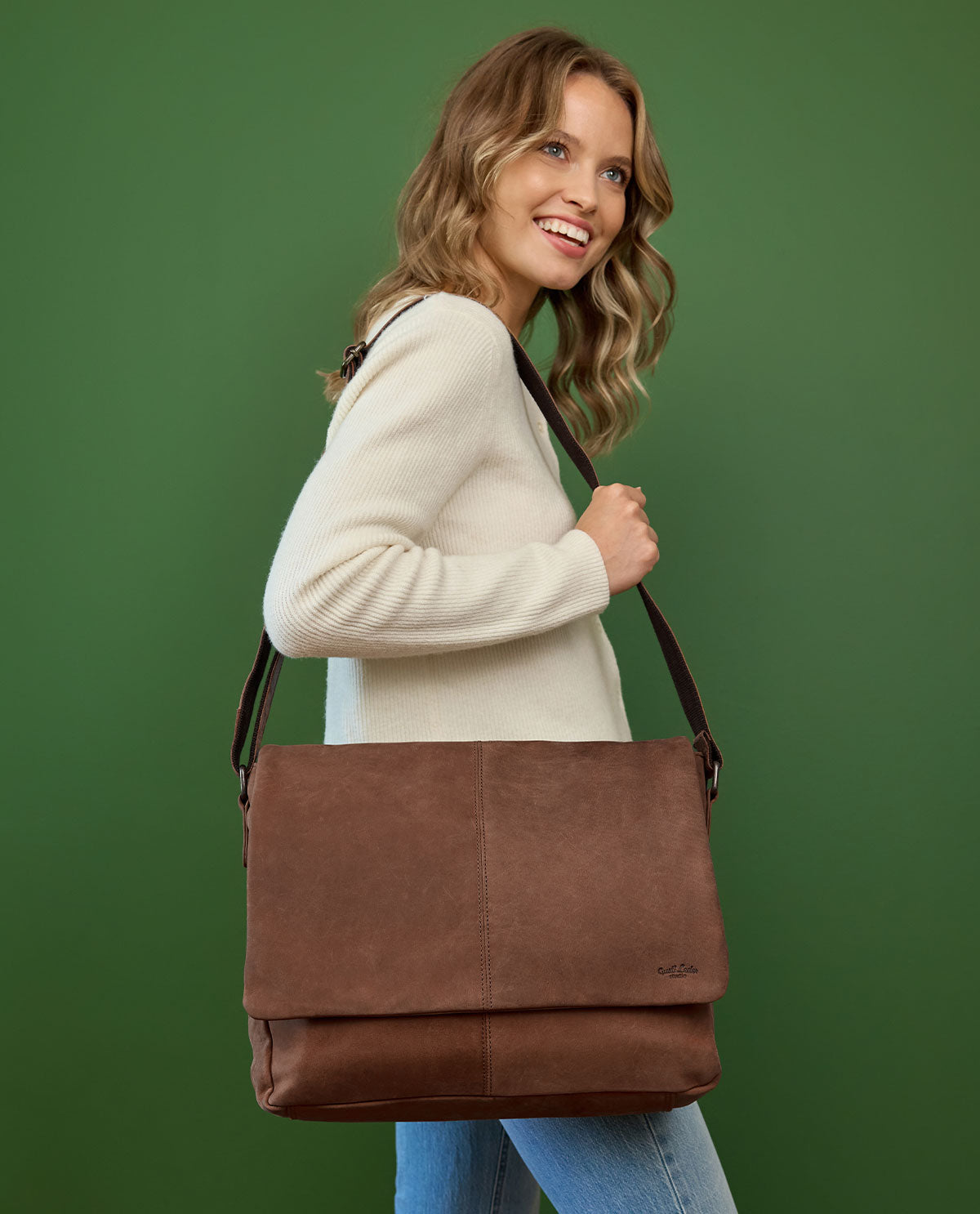 Our crossbody bag is made from high-quality, robust leather. The durable material gains character over time and develops a unique patina. Each bag is handcrafted and has its own individual features, making it a unique one-of-a-kind piece. The brown colour gives the bag an authentic vintage look that perfectly complements any outfit. Additionally, the bag offers ample storage space: the main compartment is large enough for a tablet, a notebook, or important documents. Two interior pockets and a zippered pocket provide organisation, while the adjustable shoulder strap ensures optimal carrying comfort – whether worn casually over the shoulder or crossbody.