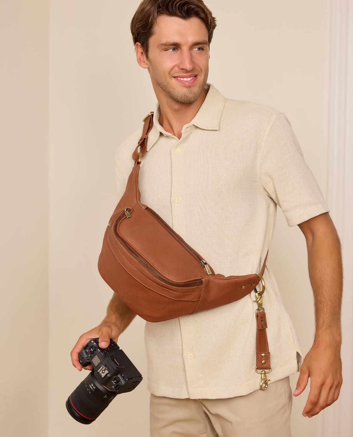 The camera bag "Paulo" in elegant brown is the perfect combination of functionality and style. Made from high-quality leather, it not only offers a simple yet elegant look but also practical details that make your daily life as a photographer easier. The main compartment with zipper provides secure storage for your camera equipment, while the lining reliably protects your devices. Thanks to the adjustable leather shoulder straps with brass fittings, “Paulo” can be comfortably worn across the shoulder, offering optimal carrying comfort whether for short trips or longer photo tours.