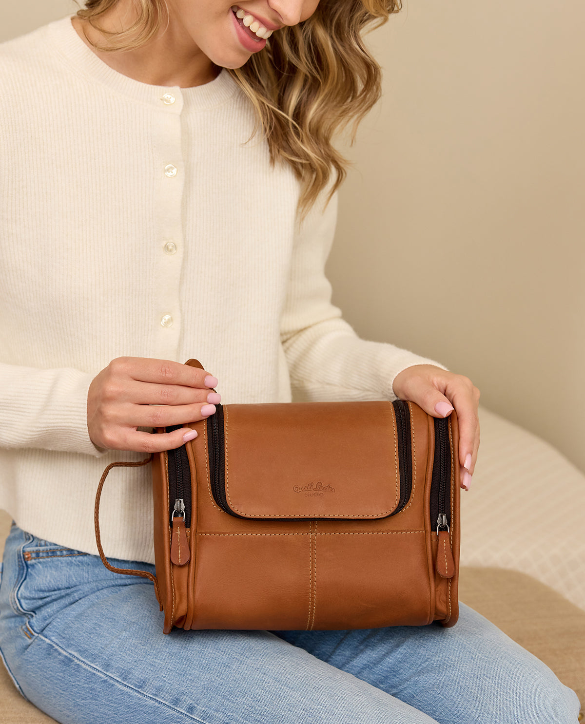 You could play hide-and-seek in this toiletry bag if you were an elf. Super spacious “Chester” has plenty of space for your toiletries. There are multiple pockets inside where you can organise your bathroom essentials. Use the two side pockets for things you need easy access to. Hang “Chester” up using the hanging loop while you’re using him. “Chester’s” lining is water-resistant, so no need to worry about small spillages. We’ve created a Gusti Leather toiletry bag that isn’t just functional, it’s super stylish too. Choose between a stylish brown or elegant black toiletry bag for your next trip away. What more could you want? You’ll never have to compromise in the bathroom again with our spacious toiletry bag “Chester”.