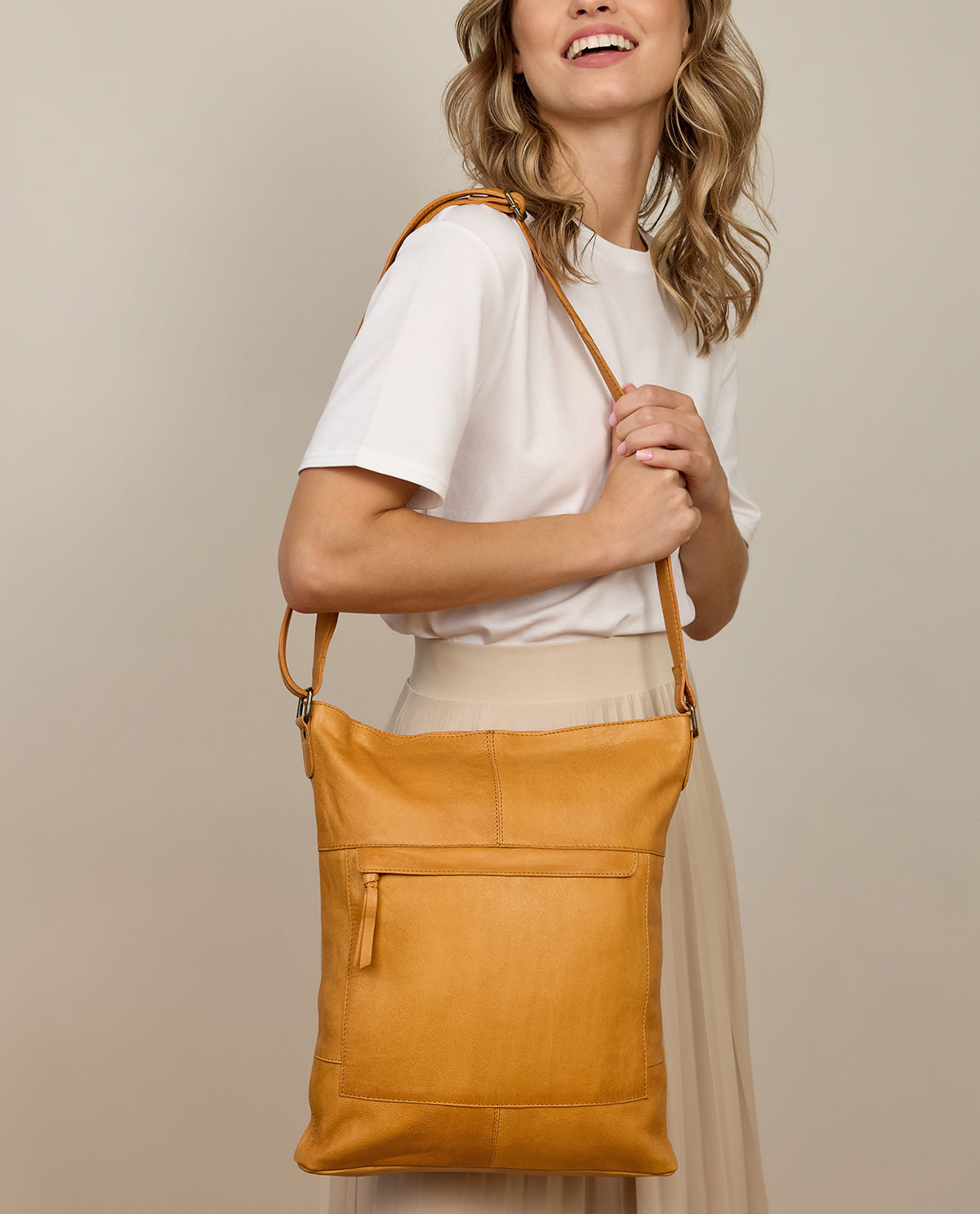 The spacious main compartment of this high-quality crafted shoulder bag made of super soft cowhide, in which you can easily store documents up to a size of DIN A4, as well as the additional slip pockets and the zipper interior pocket offer you an optimal overview of the essentials in your bag without having to rummage for a long time. And to ensure that everything you carry with you is safely stored and well protected, "Maola" closes with a wide sturdy zipper. In addition, another zipper pocket is integrated into the design on the front, where you can always keep smaller items like a smartphone or headphones within easy reach. The length-adjustable shoulder strap provides the necessary comfort and flexibility, so you can wear "Maola" either as a shoulder bag with a short strap or as a classic crossbody bag.