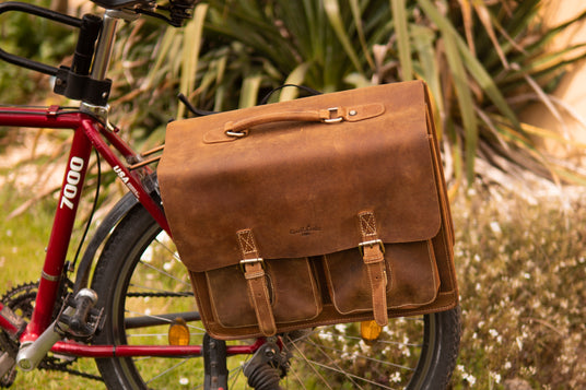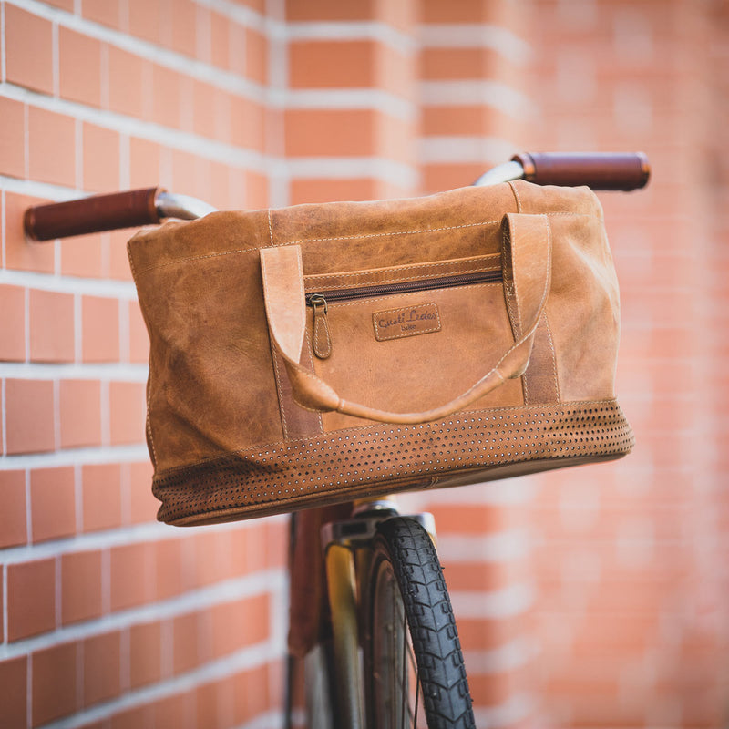 Say goodbye to heavy backpacks! Let your bike do the work and use our leather bags, tote bags, and briefcases. Robust and weatherproof designs protect your essentials from dust, wind, and sun – while adding a touch of elegance to your ride.