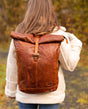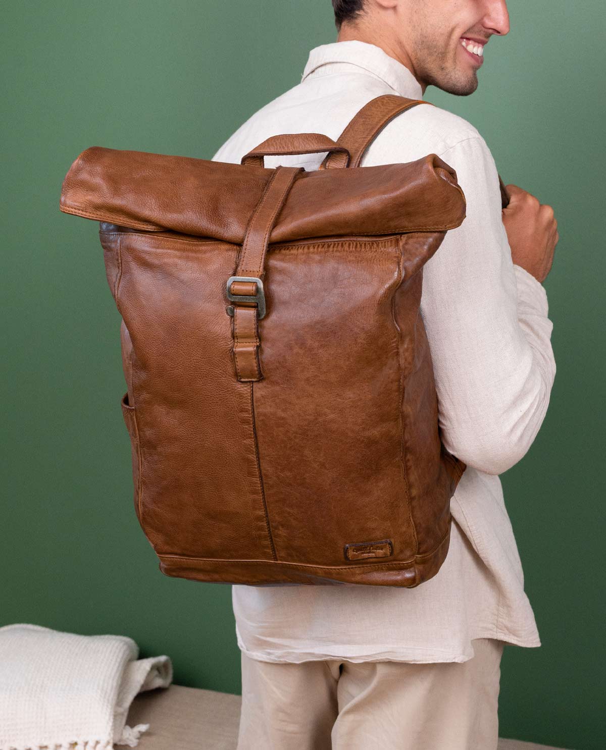 Our “Bendik” rolltop backpack is the perfect companion, no matter if you’re going to school, uni or work. He’ll win you over with his flexibility, comfort, and space. This sturdy, classic daypack made of brown leather stands out from the crowd with its trendy rolltop—a look that you just can’t ignore at the moment.