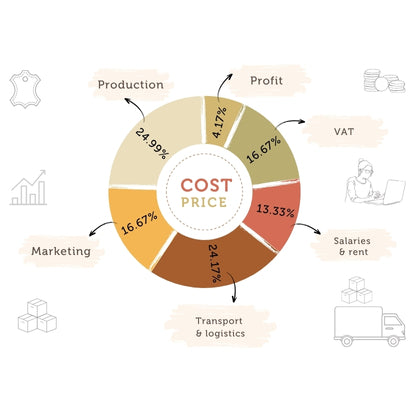 High-quality leather doesn't have to be expensive! Our prices are transparent, consistent, and carefully calculated—with no hidden costs. Thanks to our in-house production, sustainable packaging, and a well-designed logistics system, we can offer our leather products at unbeatable prices. This means you get the best quality without having to compromise. Our goal? To ensure that your new leather product is not only affordable, but also becomes your everyday companion!