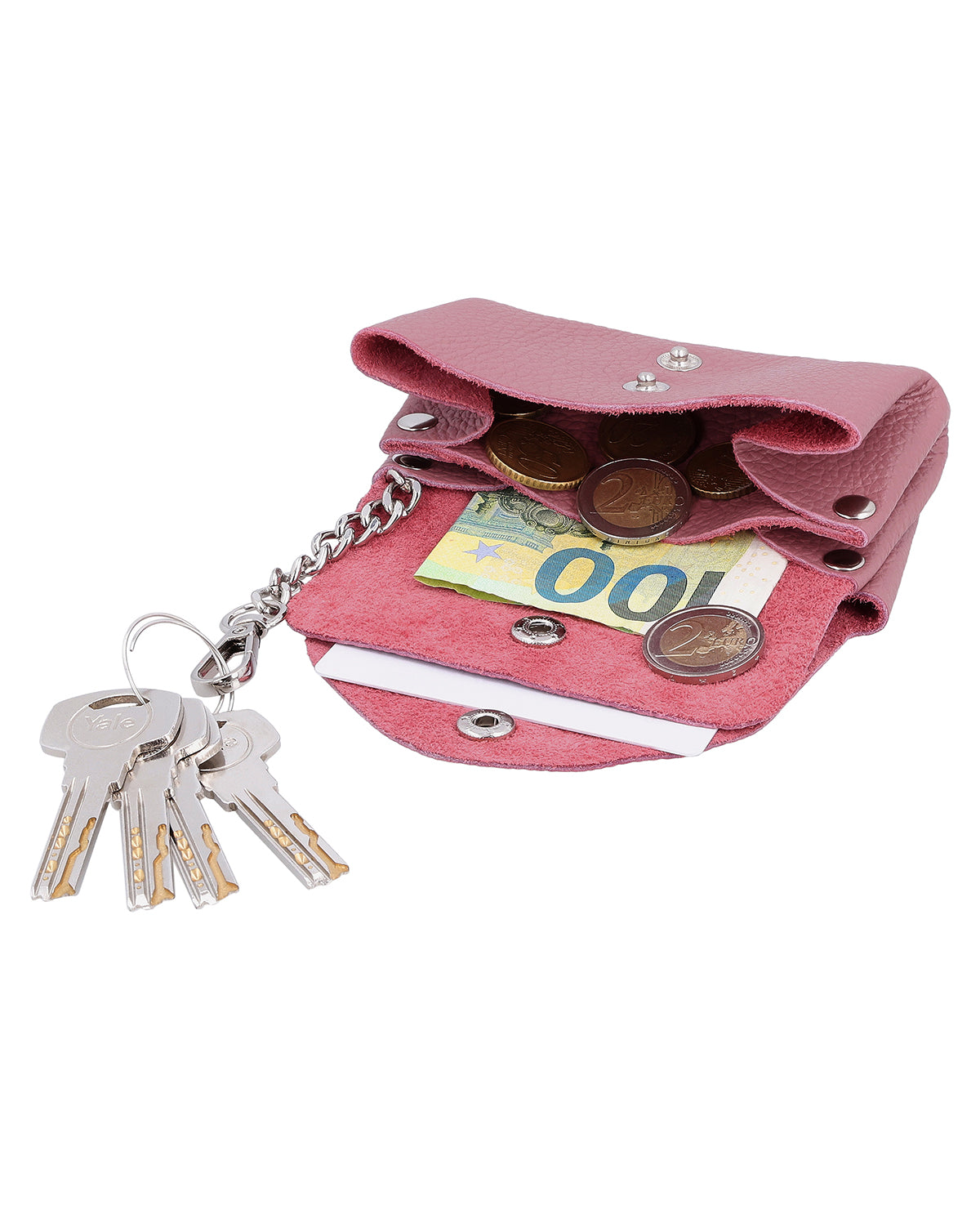 The "Mathilda" key case combines Italian craftsmanship with a stylish, practical design. Made in Italy from high-quality leather, it fits comfortably in your hand and accompanies you as a discreet yet elegant accessory in everyday life. The secure snap closure ensures that your keys are always protected, while the sturdy metal key hook keeps your most important keys firmly in place. Thanks to its compact shape, "Mathilda" fits easily into any bag – ideal if you value both order and elegance.