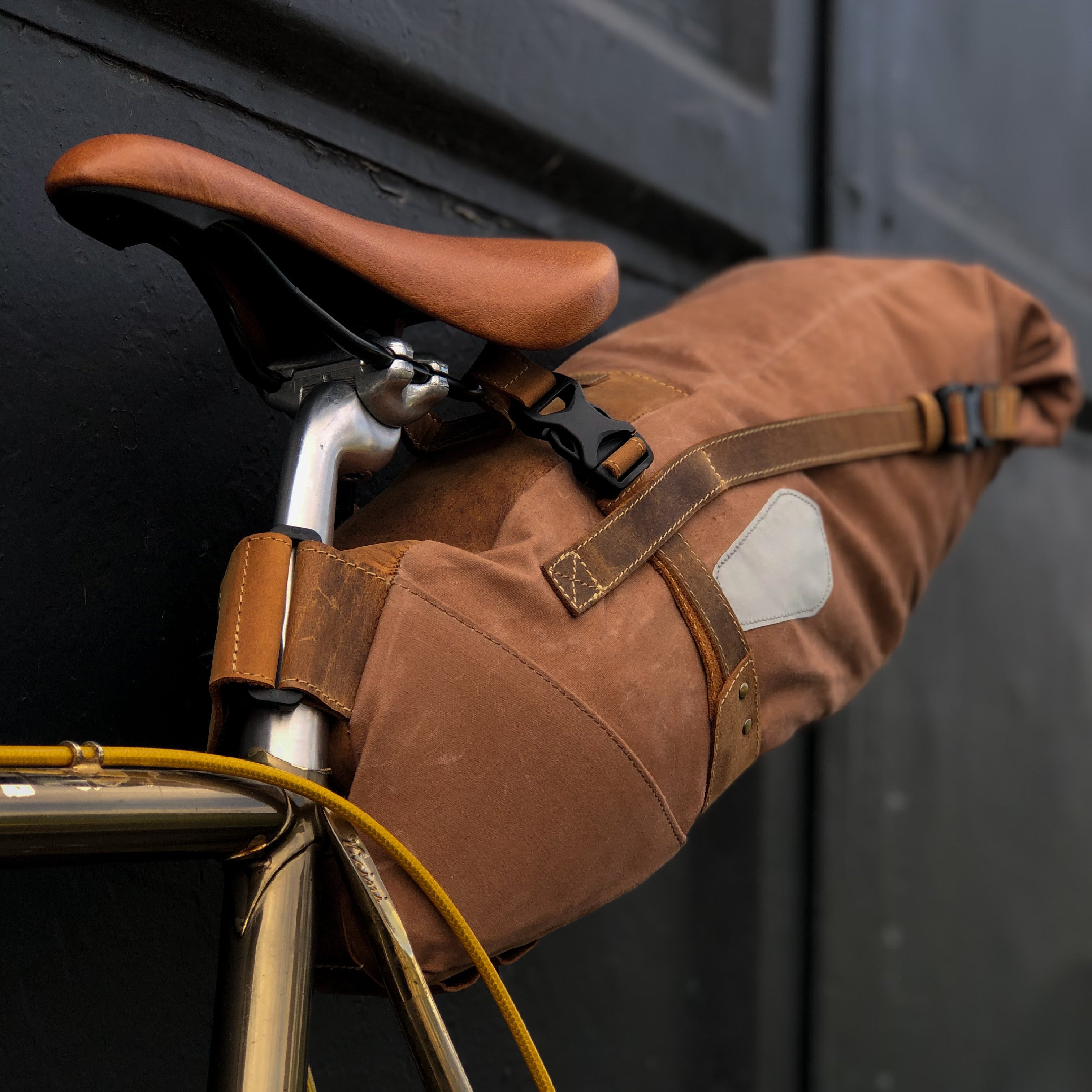 Thanks to "Romain M's" practical roll-top, your belongings stay securely stored and easily accessible at all times. The bag is attaches securely around the saddle stem using a wide leather strap with velcro, while additional leather straps with buckles ensure that the bag is securely attached under your saddle. Its vintage design combines functionality with a unique style that enhances every ride.