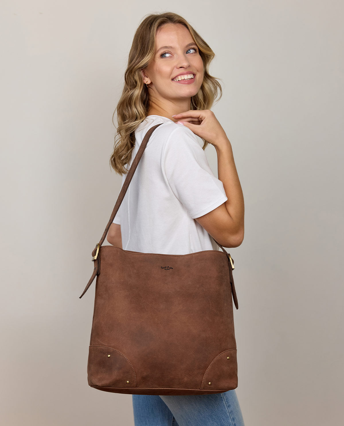 "Moje" impresses not only with its functionality but also with its high-quality details. The interior compartment additionally offers a zipper pocket for even more security and storage space. The leather patch for engraving gives the bag a personal touch, while the decorative brass rivets on the front corners add that certain something. The bag is an ideal choice for women who value both style and practical use – perfect for every day, at the office, or when traveling.