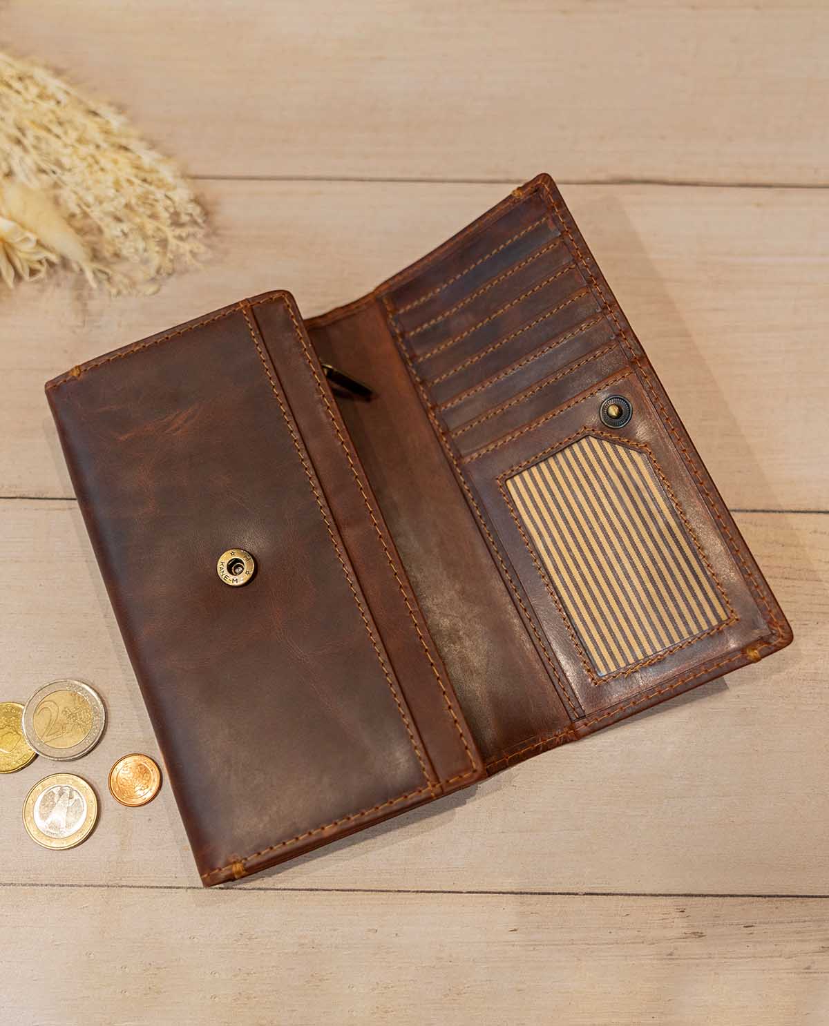 Discover our high-quality women's wallet "Angelique" made of brown leather – an elegant companion that perfectly combines design and functionality. Inspired by the urban Berlin flair, it is ideal for your everyday life, whether shopping in the city, at the café, or traveling. The genuine, durable leather ensures a noble look and a pleasant feel that becomes even more beautiful over time. "Angelique" stands for style, quality, and organization – everything you expect from a modern wallet.