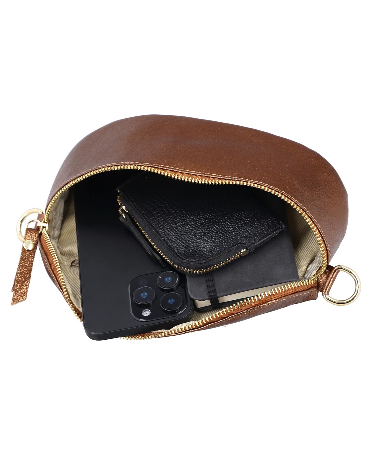 Die "Brinja" Umhängetasche besticht durch ihr elegantes Design und ihre hohe Funktionalität. Mit der markanten, halbrunden Silhouette und dem vollständigen Reißverschluss entlang des oberen Randes bietet sie nicht nur ausreichend Platz für Deine Essentials, sondern auch Sicherheit für all Deine persönlichen Gegenstände. Das hochwertige Leder verleiht ihr eine edle Optik, die sich perfekt in Deinen modernen Alltag einfügt. Im Inneren findest Du zudem das fein eingeprägte "Made in Italy"-Logo, das die Herkunft und Qualität dieser Tasche eindrucksvoll unterstreicht.