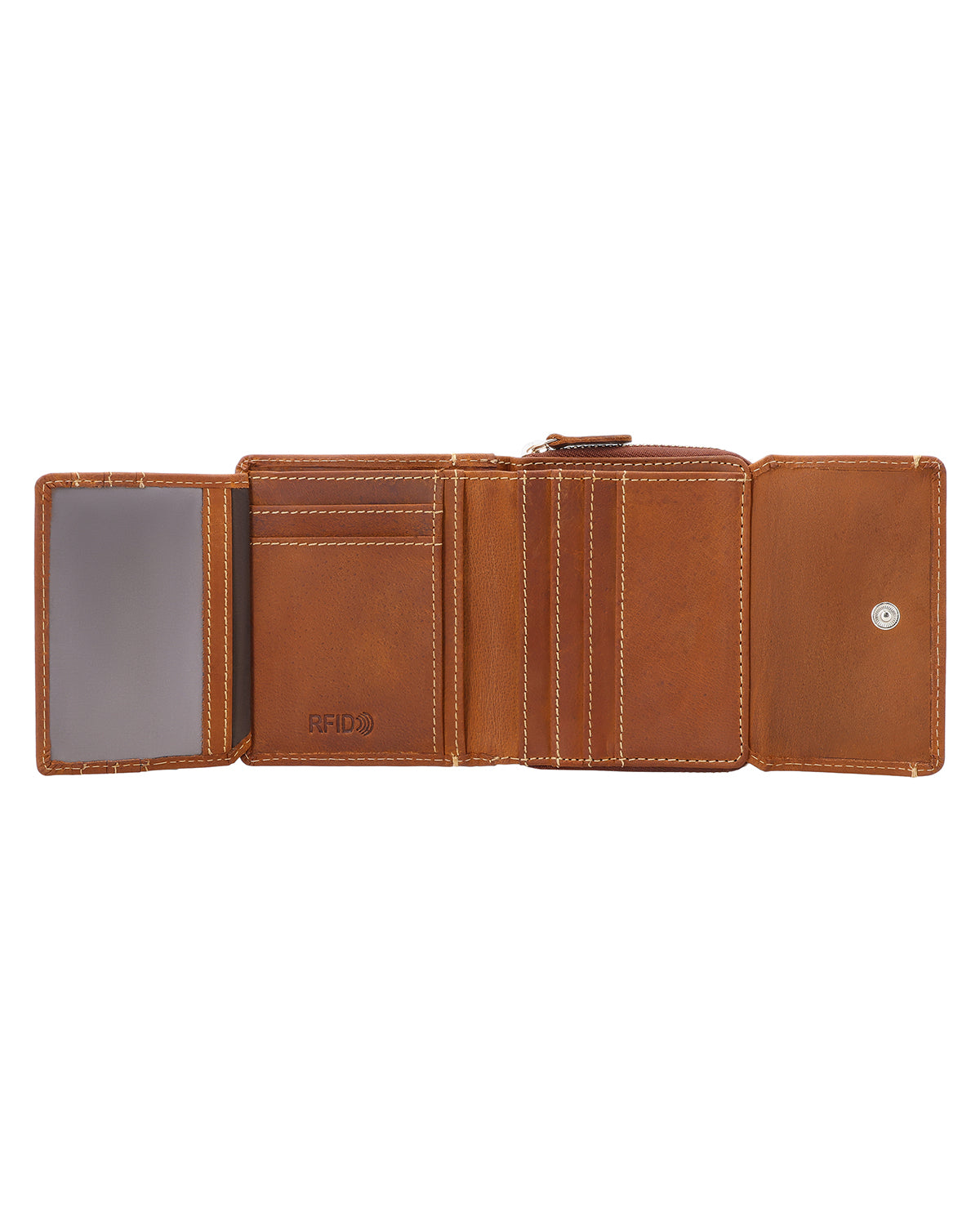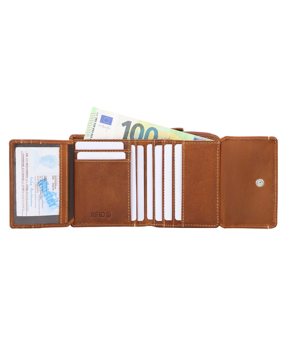 Im Inneren verfügt „Brigitta“ über ein Geldscheinfach, ein ausklappbares Sichtfenster, Platz für bis zu sechs Karten sowie ein separates Münzfach mit Reißverschluss, das verhindert, dass Münzen unkontrolliert herausfallen. Aus hochwertigem Büffelleder gefertigt, wird das Portemonnaie sicher mit einem Druckknopf verschlossen. So bist Du jederzeit bereit für den Tag. Der integrierte RFID-Blocker in der Geldbörse stört die Signale von Lesegeräten, schützt Deine Karten und sorgt für die Extraportion Sicherheit.