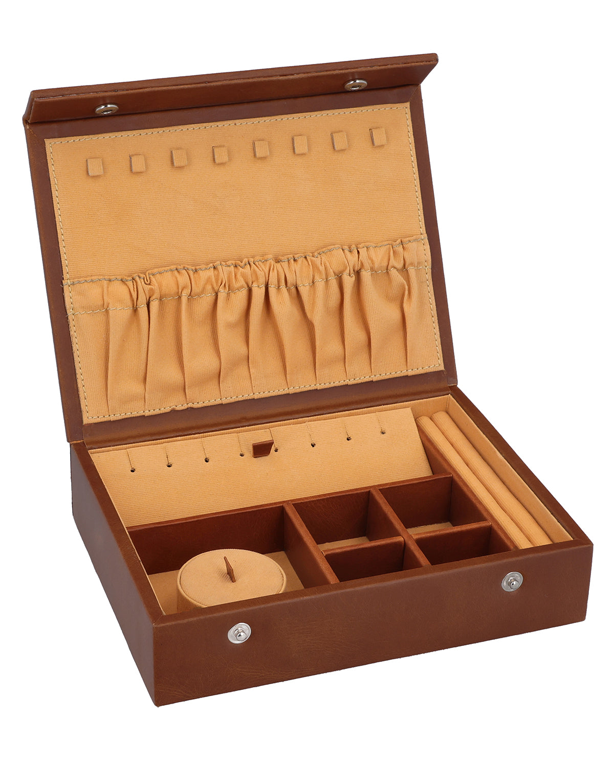 Mit "Bine" bringst Du Ordnung und Stil in Deine Schmucksammlung. Gefertigt aus hochwertigem Leder begeistert sie durch ihre edle Optik und das weiche, schützende Innenfutter, das Deine Lieblingsstücke zuverlässig vor Kratzern bewahrt. Die durchdachte Aufteilung mit mehreren Fächern für Ringe, Ohrringe, Armbänder und Halsketten sorgt dafür, dass jedes Schmuckstück seinen Platz findet. Ihr elegantes Design macht "Bine" nicht nur zu einem praktischen Organizer, sondern auch zu einem stilvollen Accessoire für Deinen Schminktisch oder Dein Reisegepäck.